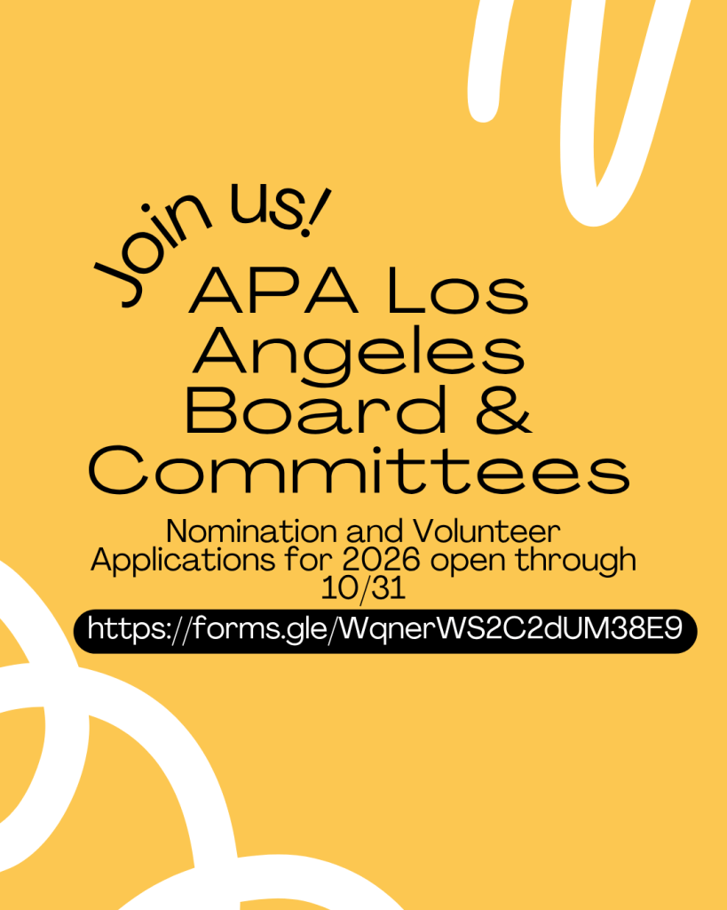 APA Los Angeles is also seeking volunteers for the following committees to serve at will for 2026. All interested members of APA will be invited to join the committee of their choice. A one-year commitment is requested.